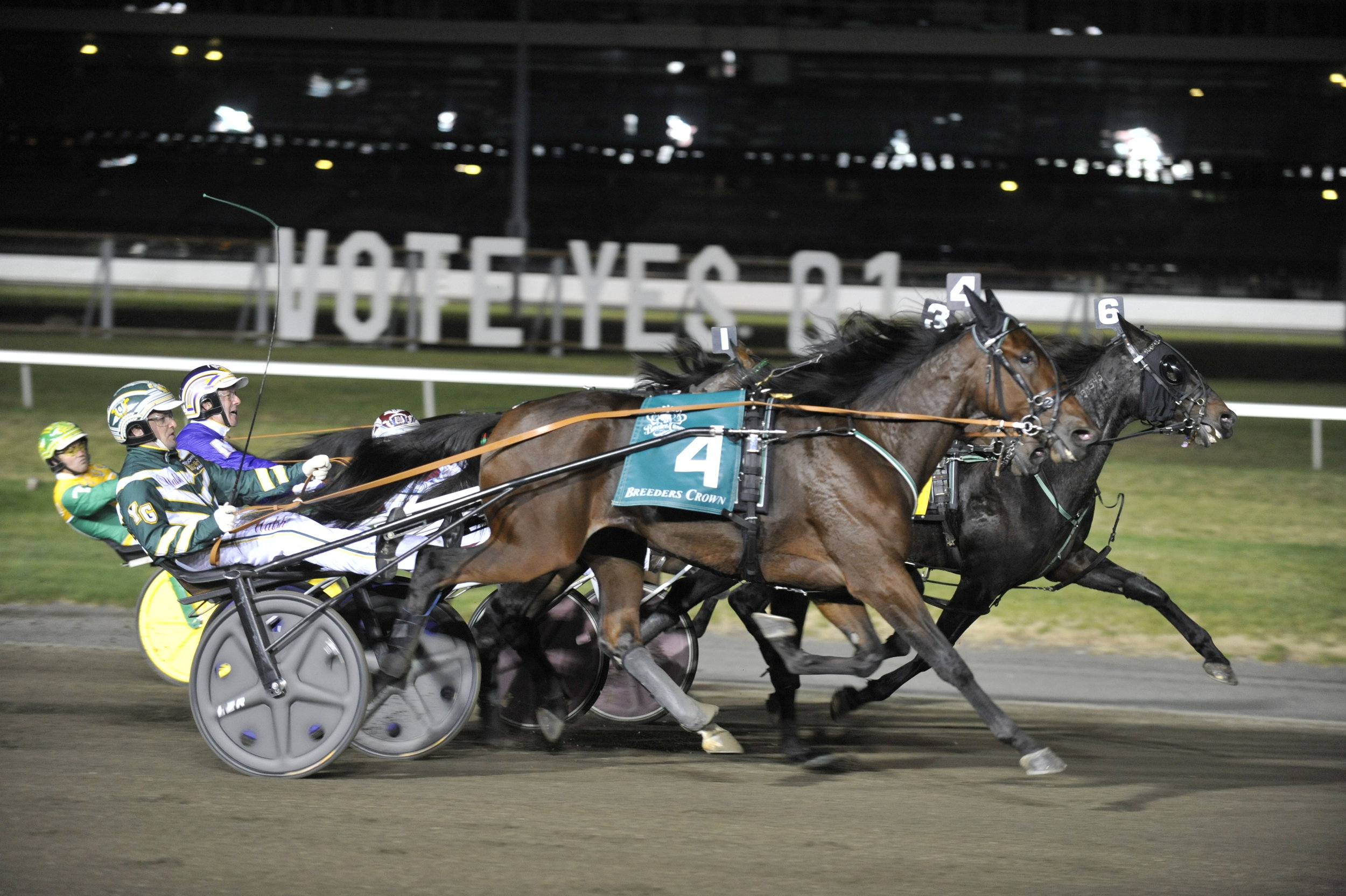 “Last week she got a little hot on me,” said winning driver Yannick Gingras. “But they went big fractions, so I was able to race her from behind, but last week she was really grabby and I really believe I choked her. Even at the top of the stretch, I still had a stranglehold of her and then two steps later I had two loose lines. I’m pretty sure she choked last week. The credit goes to Jimmy, he made equipment changes and obviously they worked tonight.