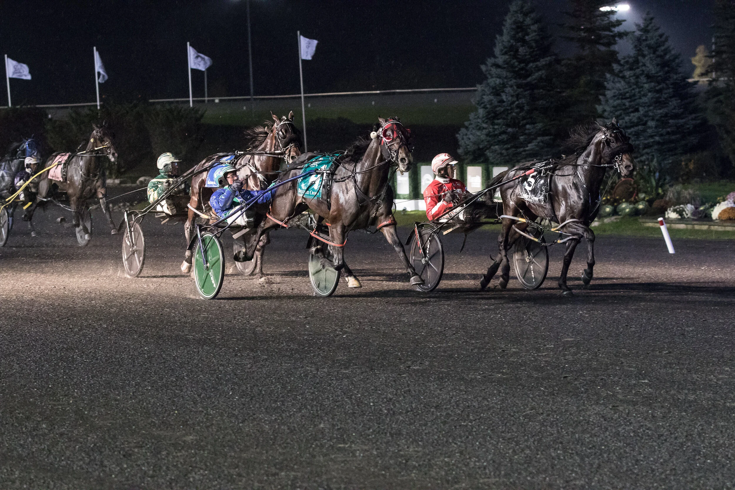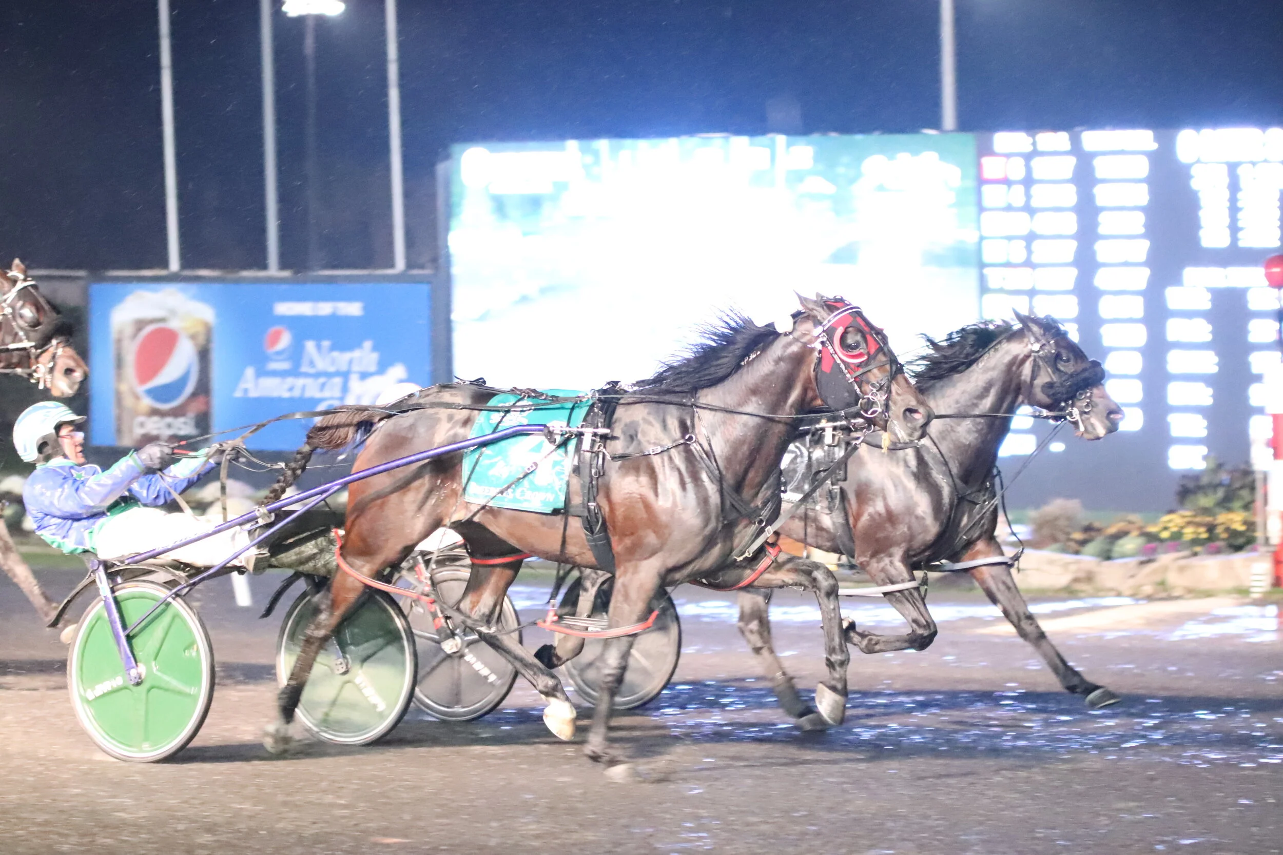 MILTON, ONTARIO, October 26 – Dancin Lou displayed tremendous determination to track down and nail Bettors Wish at the finish line to win the $786,000 (CAD) Breeders Crown 3-Year-Old Colt Pace on Saturday at Woodbine Mohawk Park.