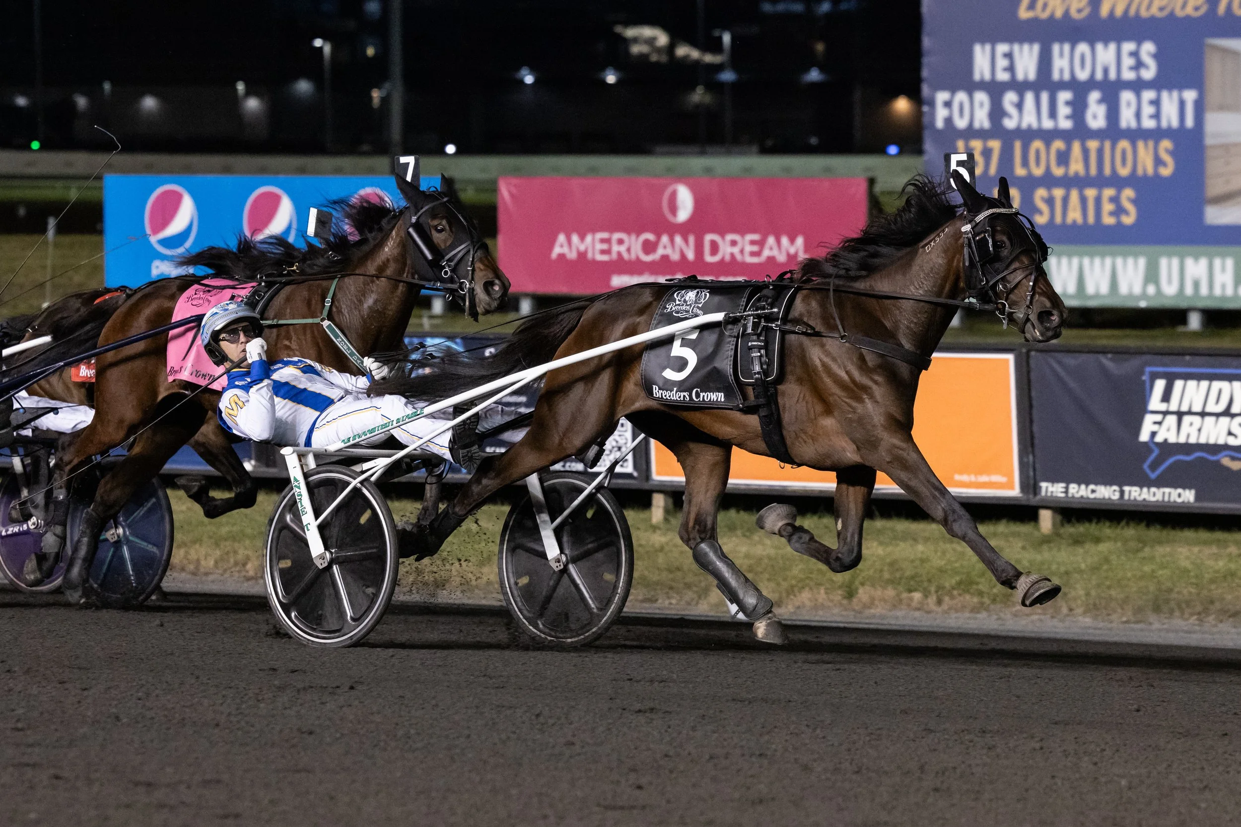 EAST RUTHERFORD, N.J. — Lady Landia, with James MacDonald at the lines, soared late to catch Miss Belmar and win the $700,000 Breeders Crown 2-year-old Filly Trot final, on Friday (Oct. 25) at the Meadowlands, in a career-best 1:53.3.