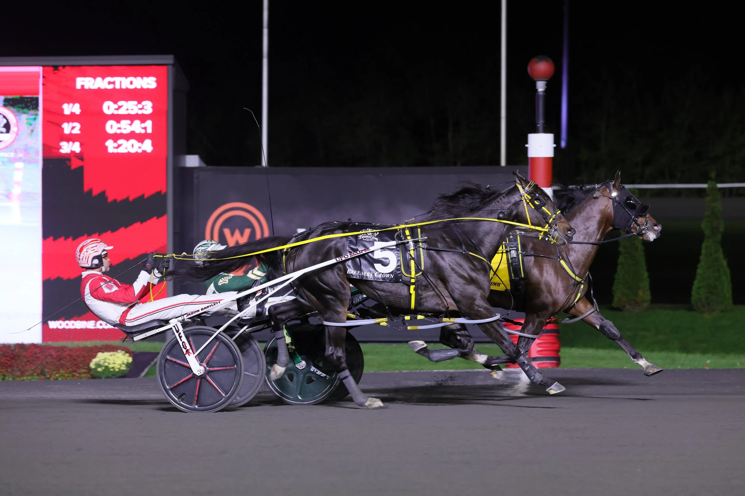 The all-time Breeders Crown pacing record of 1:46.4 set in the penultimate start of Bulldog Hanover’s sensational 2022 season snapped cleanly on Saturday night at Woodbine Mohawk Park when 6-5 favorite Ervin Hanover uncorked a furious back half to claim the $822,000 Grade 1 Breeders Crown Open Pace with a 1:46.2 effort.
