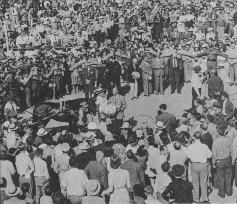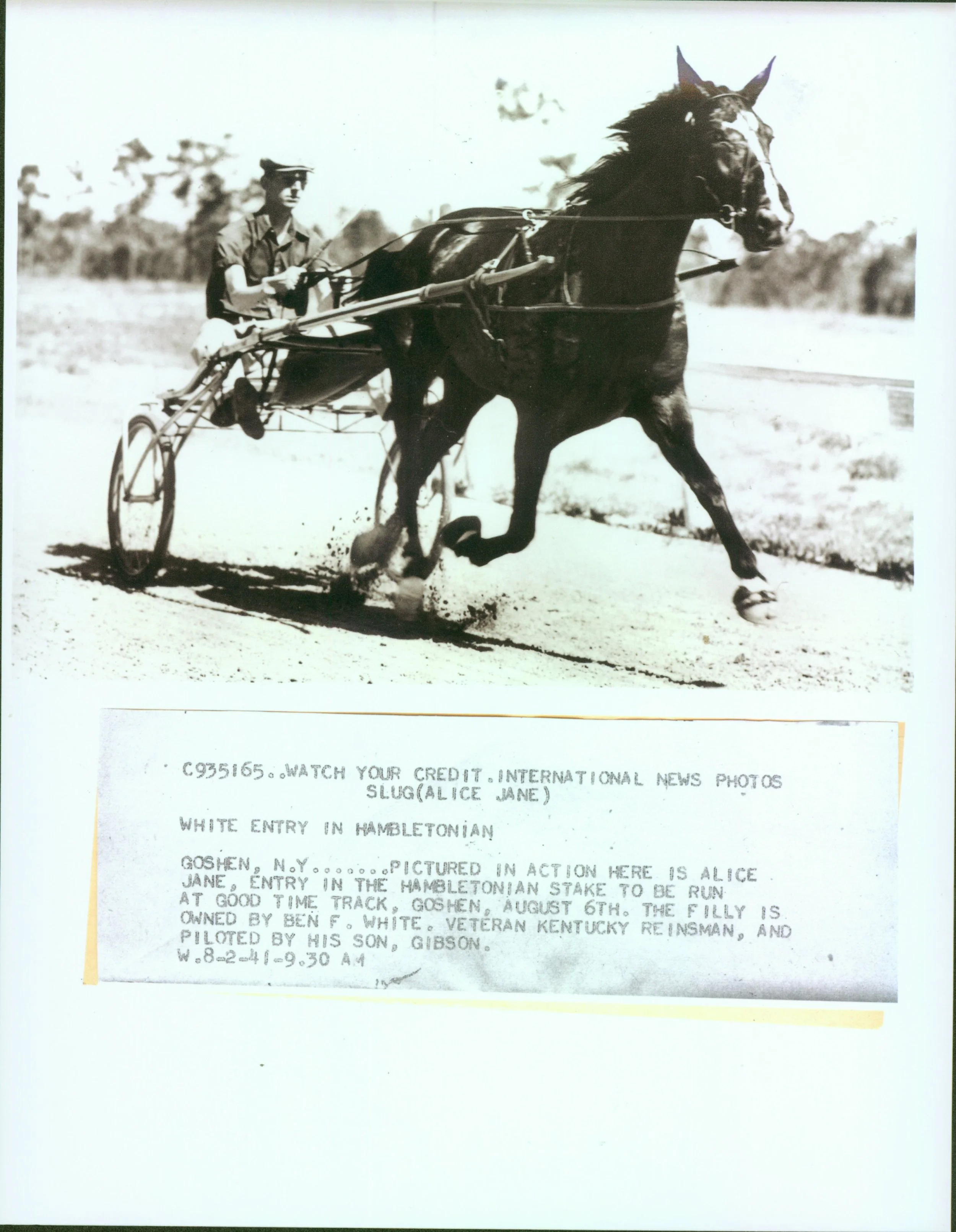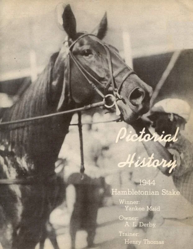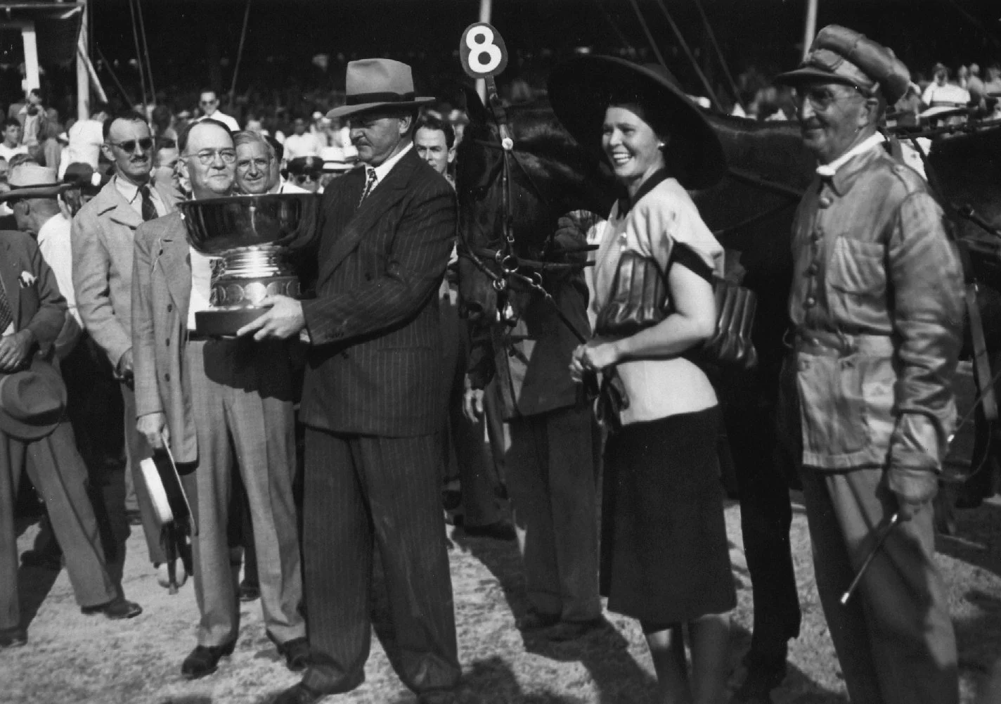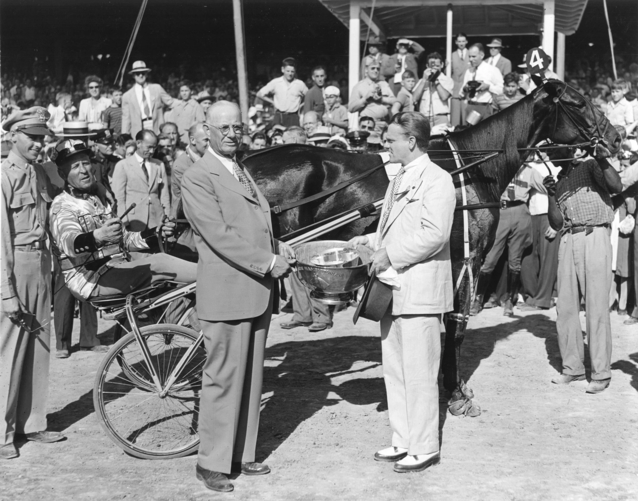 Yankee Maid was a half-sister to Greyhound (1935). Elizabeth, the dam of Yankee Maid and Greyhound, was by Peter The Great who is the leading broodmare sire of Hambletonian winners. By Volomite, Yankee Maid was the 12th of Elizabeth’s 16 foals. Fillies were 1-2 in the first heat and in the summary. Emily Scot, the second filly, was the dam of 1958 winner Emily’s Pride and the granddam of Noble Victory, the favorite in 1965. Yankee Maid’s caretaker, "Jimtown" Burbage, enjoyed a career association with champions. He also reportedly groomed Dark Rex, a three and five-gaited American Saddlebred champion, and 1933 Kentucky Derby winner Broker’s Tip. Hollywood star Jimmy Cagney presented the Hambletonian trophy as he had done in 1942. Thomas’ son Dick, a respected horsemen in his own right, recalled that his dad trained some horses for Cagney in California, and that Cagney and Broderick Crawford, who were great friends, would come out to the track and join the family in their box at Santa Anita.