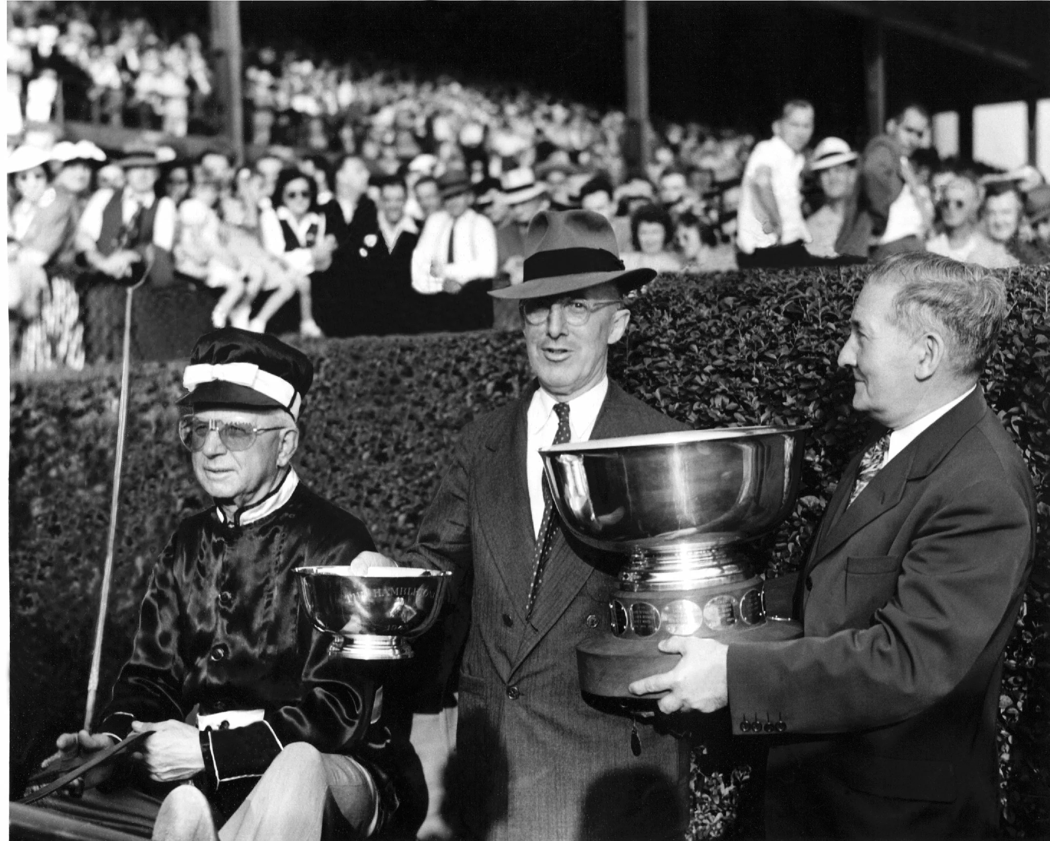 One of the longest shots to win the Hambletonian, The Ambassador was 33-1 when he won the second heat. At $3.40 on the dollar in the third heat, he was the third longest priced winner in the final. Only The Intruder ($4.45 in 1956) and Nuclear Kosmos’ dollar odds ($3.50 in 1986) were higher. The Ambassador was a half-brother to 1932 winner The Marchioness. He was the first winner who had not started as a 2-year-old and had only won the first heat of his career a few weeks earlier. Pay Up won the first heat in 2:06 for the same connections as Bill Gallon, the previous year’s winner. Actor Jimmy Cagney presented the trophy.