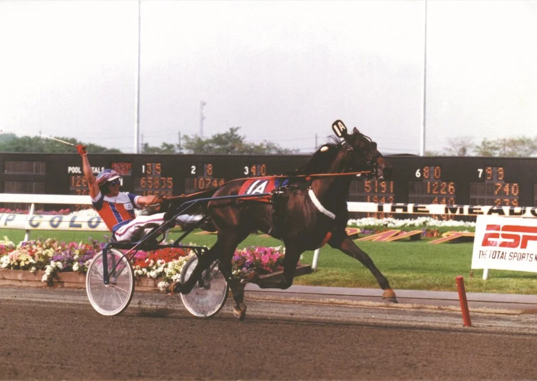 The pre-race favorite was Royal Troubador, 1989’s Two-Year-Old Trotting Colt of the Year who had already captured the Yonkers Trot. Others that merited respect included King Of The Sea, Armbro Iliad, The Devil, Crown Bones and Beacon Course victor Embassy Lobell, who was owned by a Lou Guida-managed group. Embassy Lobell captured his division of the first heat in 1:56.1 with Mike Lachance at the lines. Trapped on the rail for three-quarters of a mile. Embassy Lobell made up ground when he shook loose and trotted by Armbro Iliad in the deep stretch. In the second division, lightly-raced Harmonious, co-owned by Antonacci, didn't figure against veteran Royal Troubador. But someone forgot to tell Harmonious. John Campbell sent the strapping son of Crowning Point after Royal Troubador at the half, and blew on by to win in 1:55. Harmonious almost didn't make it to the Hambletonian, much less the second heat. Only a few days before the big day, trainer Osvaldo Formia had found the colt cut and scraped in his paddock, after hurting himself suffering from colic. The cuts weren't severe, however, and Formia treated Harmonious' colic with the human medicine Maalox. In the final heat, Embassy Lobell drew the rail and Harmonious the two-hole. Campbell elected to drop in behind Lachance and Embassy Lobell, while Royal Troubador and King of the Sea battled on the front end. Lachance made his move on Royal Troubador after that colt posted a :56.2 half, and Campbell sat in third. Royal Troubador held the lead until the three-quarter mark in 1:25, and Campbell took Harmonious around that rival and Embassy Lobell as well. Harmonious coasted under the wire a length and a half in front in 1:54.1, with Embassy Lobell second and Royal Troubador hanging on for third. It was a glorious day in the winner's circle for Lindy Farms' Frank Antonacci, his family, and trainer Formia. After the frustration of the outcome the year before, the victory was all the sweeter. And the hero of the day was the lightly-raced, slightly banged and battered Harmonious - and a dose of Maalox.