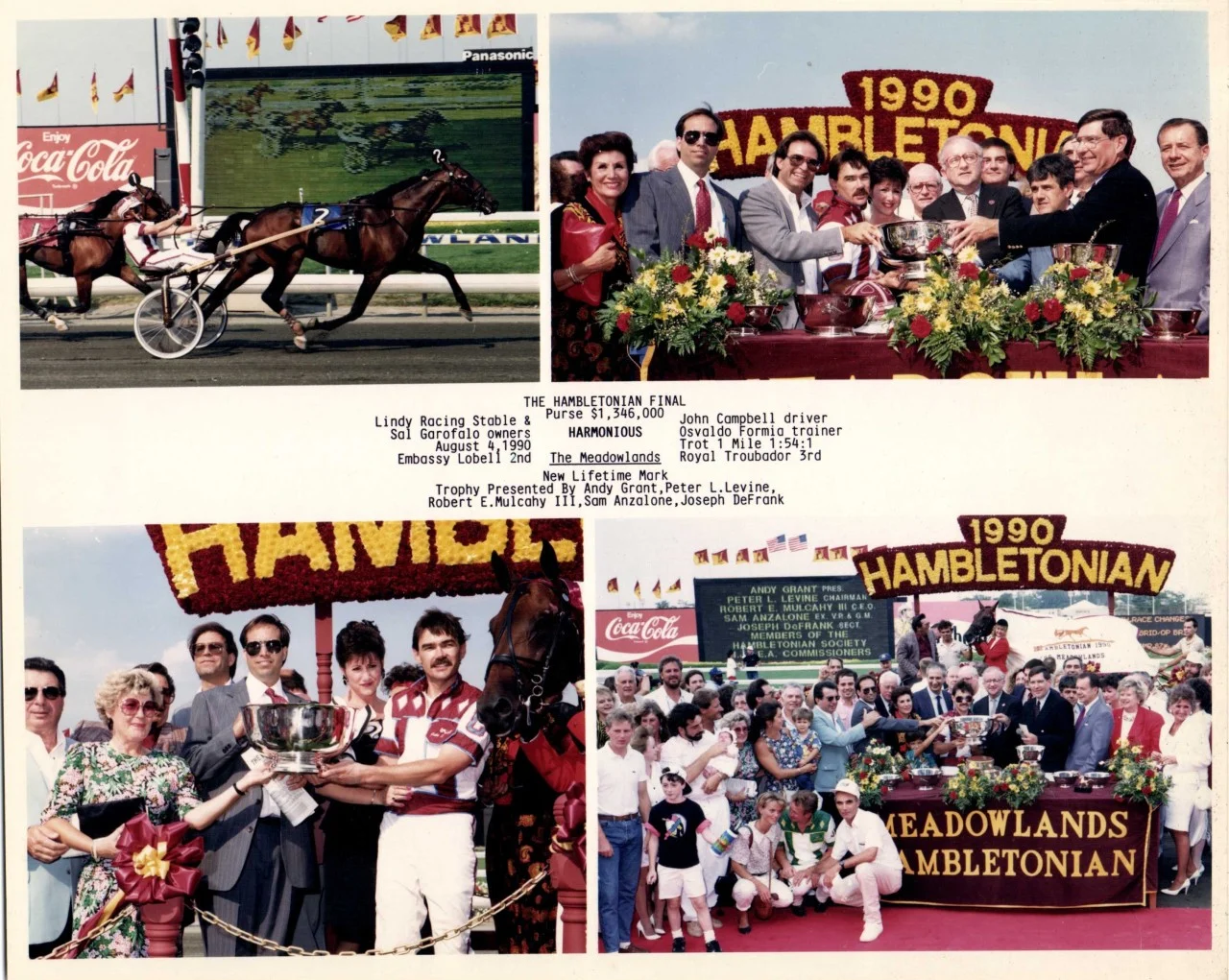 Richest Hambletonian purse ever. The Hambletonian was Harmonious' first win in a stake; although he had won four of five starts are a 3-year-old coming up to the Hambletonian. Prepped for the classic primarily in overnight races, breaking his maiden the first week of June at the Pocono Downs in a $1,500 condition event. In his next start, he made a break, finishing ninth in the American-National Stake at Sportsman's Park in Chicago. Returning to the east coast he won a qualifier and then three straight overnight races at the Meadowlands during the month of July, the fastest in 1:57 1/5. It marked the second consecutive Hambletonian winnner trained by Argentiana native Osvaldo Formia, who also was the caretaker for two Hambletonian winners: Speedy Somolli (1978) and Lindy's Pride (1969). Harmonious was voted Trotter of the Year. Harmonious was from the first crop of Crowning Point, one of only six Hambletonian winners produced in their sire's initial foaling crop. The five others: Hoot Mon (Helicopter, 1953); Speedster (Speedy Scot, 1963); Ayres (Timothy T, 1970); Green Speed (Duenna, 1983); Mystic Park (Mack Lobell, 1987); and Valley Victory (Victory Dream, 1995).