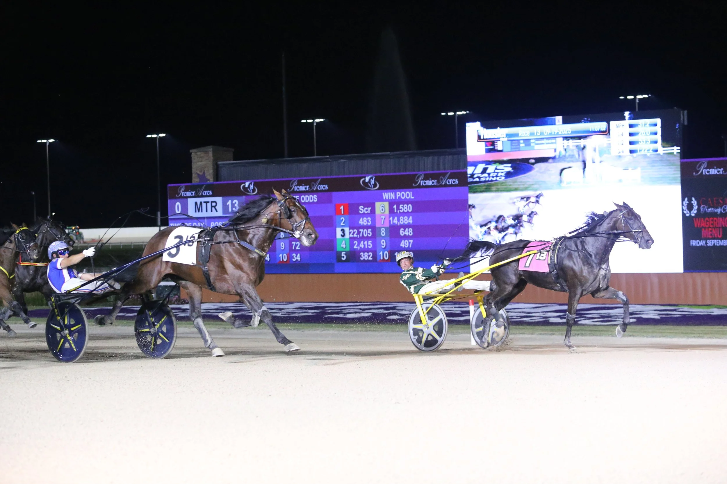 Favorites delivered in the main events of Harrah’s Hoosier Park’s Caesars Trotting Classic card presented by Kountry Lane Standardbreds on Friday, Sept. 20. Winner’s Bet steamrolled in stakes record equaling time of 1:50.3 in the seventh edition of the Trotting Classic, while Little Rocket Man emerged atop a thriller in the $165,000 Harrah’s Hoosier Park Pacing Derby.
