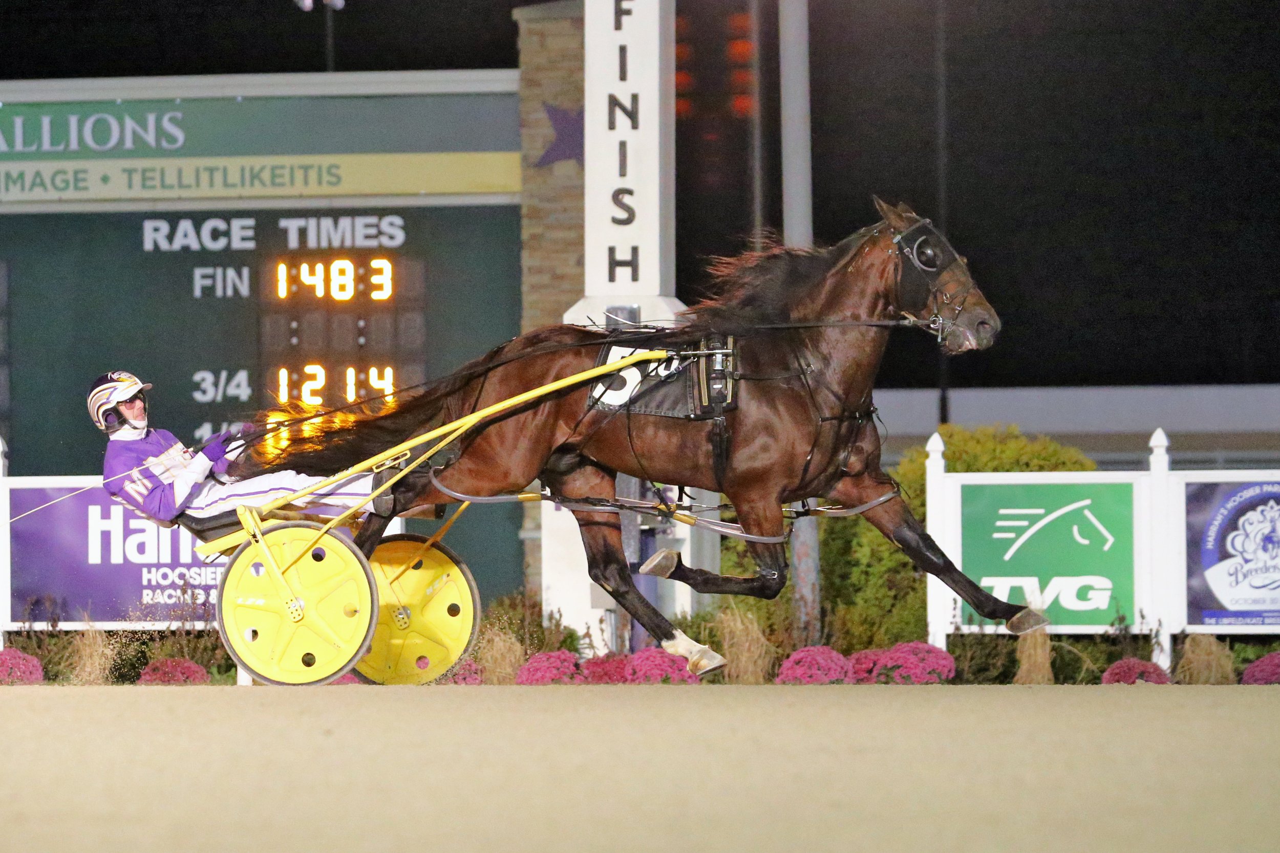 Some of the sport’s brightest stars were back in action at Harrah’s Hoosier Park on Friday, November 5 as they hosted a stakes filled card highlighted by the $220,000 Monument Circle Pace for three-year-old pacing colts. After an eye opening 1:48 score against stakes company on a sloppy rated track last week, Bulldog Hanover turned in another gritty performance to capture the $220,000 Monument Circle Pace. With driver John DeLong in the bike for trainer John Darling, Bulldog Hanover chased down upset minded Gamblin’ Mo and Sam Widger and stop the timer in 1:48.3. The 1:48.3 effort equaled the stakes record for The Monument Circle Pace set by Downbytheseaside and Chris Page in 2017 and equaled in 2020 by World Champion Cattlewash and Dave Miller.