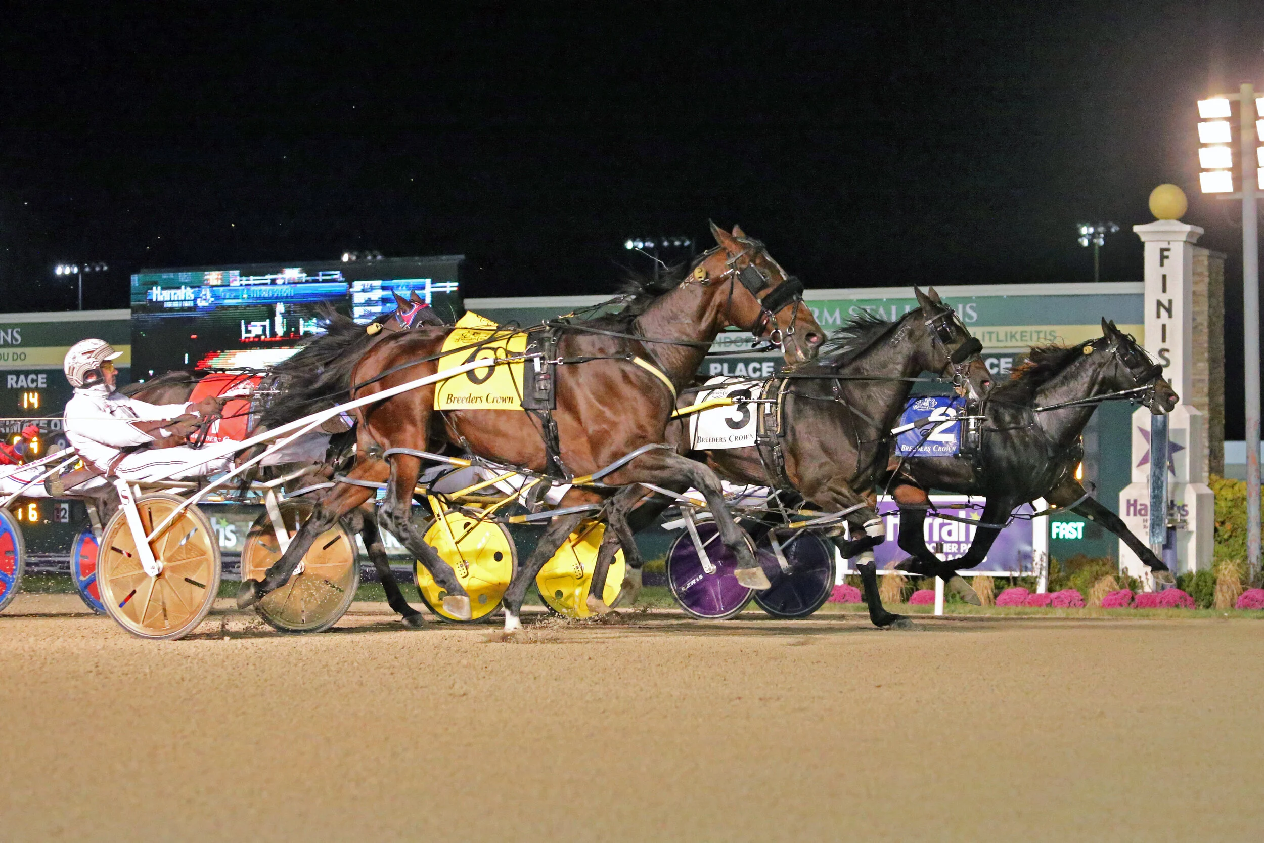 ANDERSON, Ind. — A highly anticipated clash between Breeders Crown elimination winners Perfect Sting (David Miller) and Southwind Gendry (Yannick Gingras) on Friday (Oct. 30) at Harrah’s Hoosier Park did not disappoint. In fact, it was epic, as Summa Cum Laude (Brian Sears) inserted himself into the fray right at the line to not only finish of front of Southwind Gendry, but to dead heat with Perfect Sting in the $600,000 Breeders Crown for 2-year-old colt and gelding pacers in 1:50.2. It was the first occasion in the 37 editions of the Breeders Crown that there has been a dead heat for a victory.