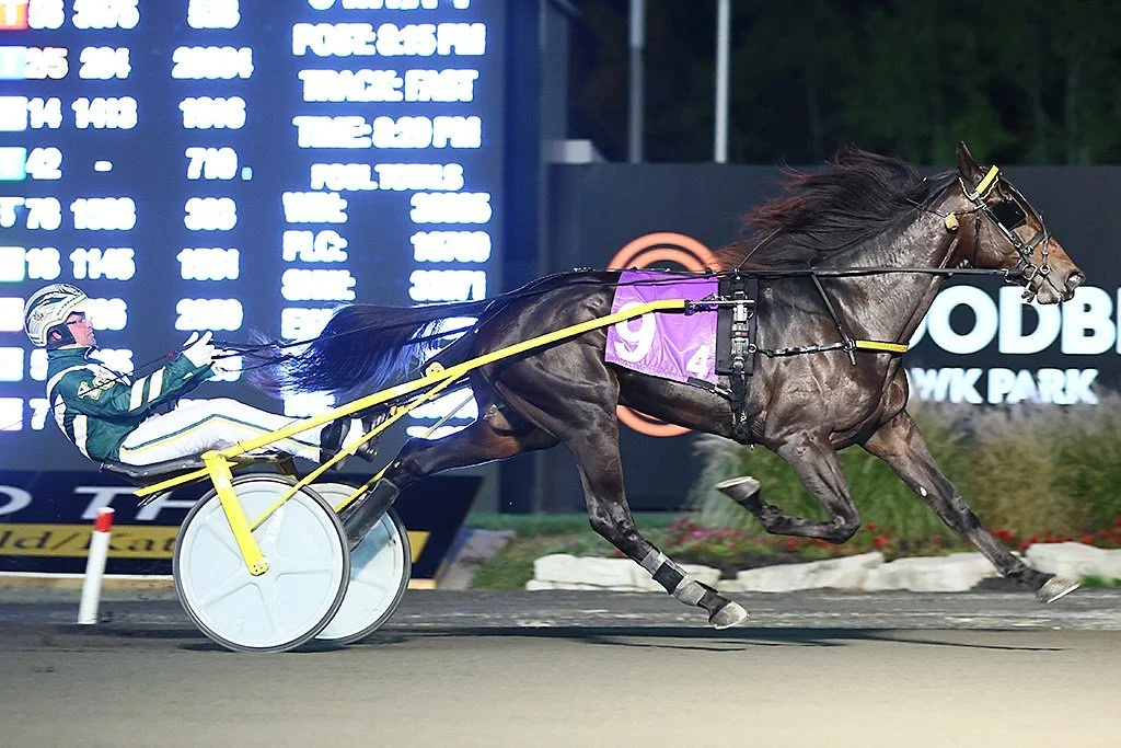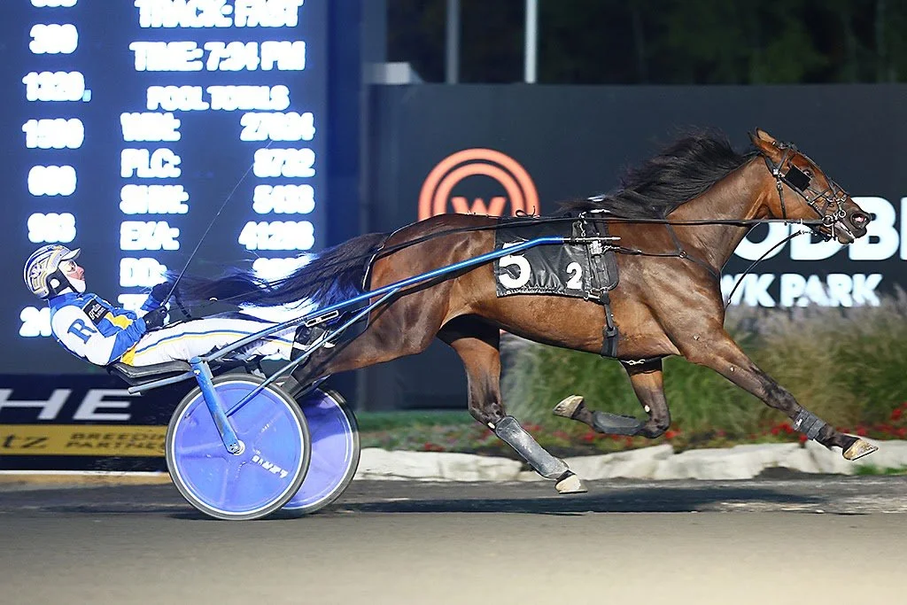MILTON, October 21, 2022 - Gaines Hanover and driver Louis Philippe Roy took control of the pace at the quarter pole and then went on to a powerful track record setting (2-Year-Gelded Trotter) performance in capturing the first of two $33,750 eliminations for the Breeders Crown 2-year-old colt and gelding division at Woodbine Mohawk Park on Friday night.